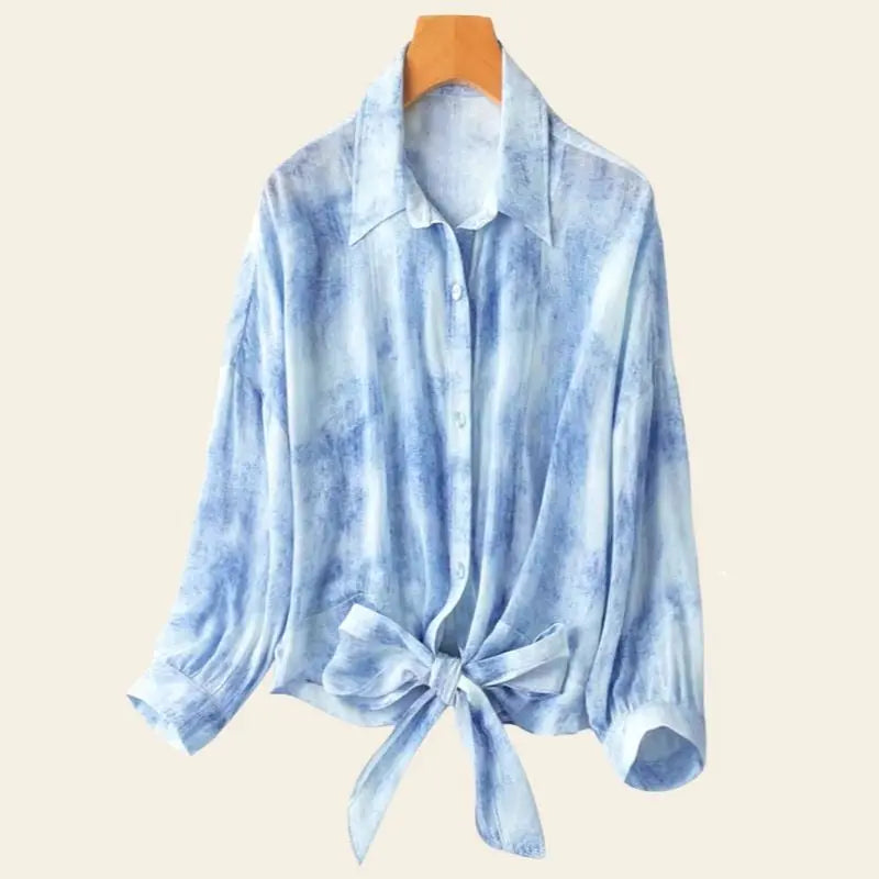 Le chemisier fluide bleu ciel à nœud en soie de mûrier s’accorde à merveille avec un pantalon en soie, une jupe midi élégante ou un jean casual pour un style contrasté. Idéal pour le printemps et l’été, il peut se porter seul ou accompagné d’un blazer léger. Une source d’inspiration pour toutes les occasions.