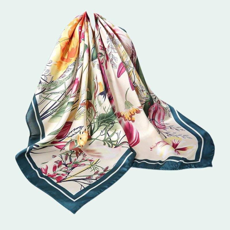 Ce foulard carré en satin au motif botanique vert et bleu apporte une touche naturelle et raffinée à vos tenues. Léger et fluide, il se porte autour du cou, en bandana ou en châle. Son satin de polyester offre un tombé élégant, idéal pour accessoiriser vos looks toute saison.